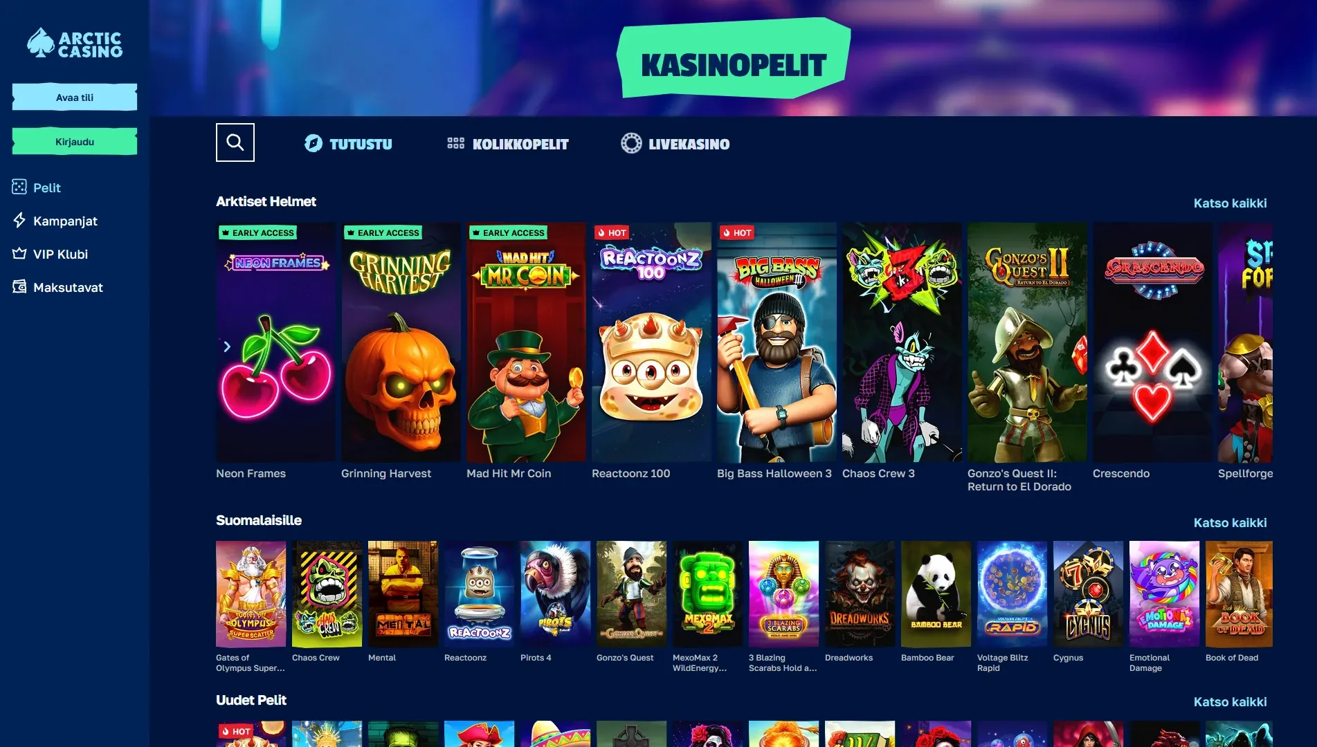 Arctic on suomeksi toteutettu, helppokäyttöinen kasino, jossa hommat lähtee käyntiin nopeasti. Lunasta tervetulobonus kahdelle talletuksellesi, pelaa tuhansia hitti-pelejä ja nappaa halutessasi kierrätysvapaa käteispalautus. MGA-lisenssi tuo turvallisuutta ja sujuvuutta pelaamiseesi!
