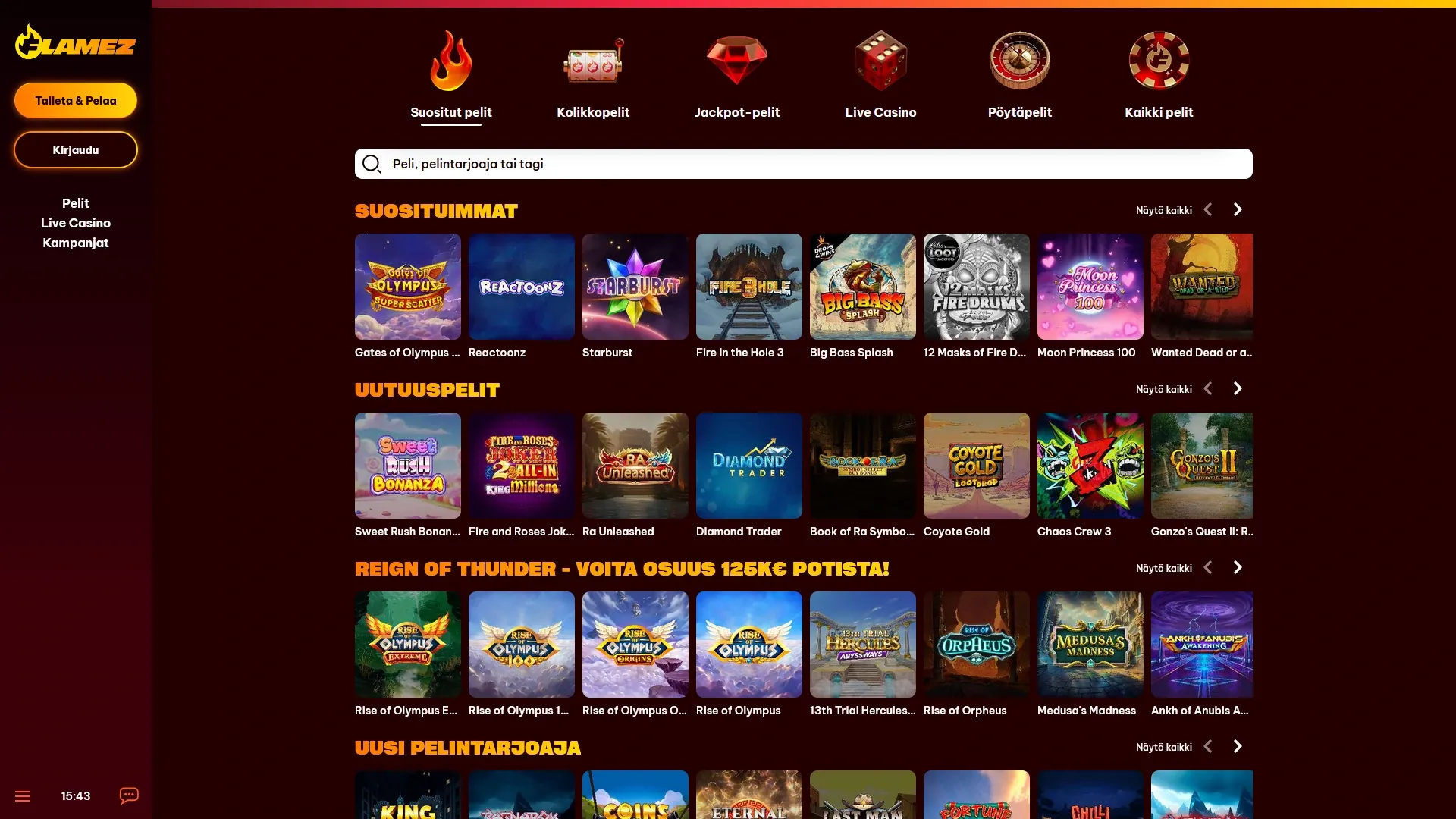 Flamez kokoaa saman katon alle yleisön suosikit ja uutuudet. Tarjolla on valtava määrä slotteja, pöytäpelejä ja livetuotantoa (mm. Play’n GO, Pragmatic Play, Games Global, Relax, Yggdrasil, Quickspin, Hacksaw, Thunderkick). Hittilistalla vilahtelee Reactoonz, Gates of Olympus 1000, Fire in the Hole 2, The Dog House Megaways ja Crazy Time – jokaiselle jotakin.