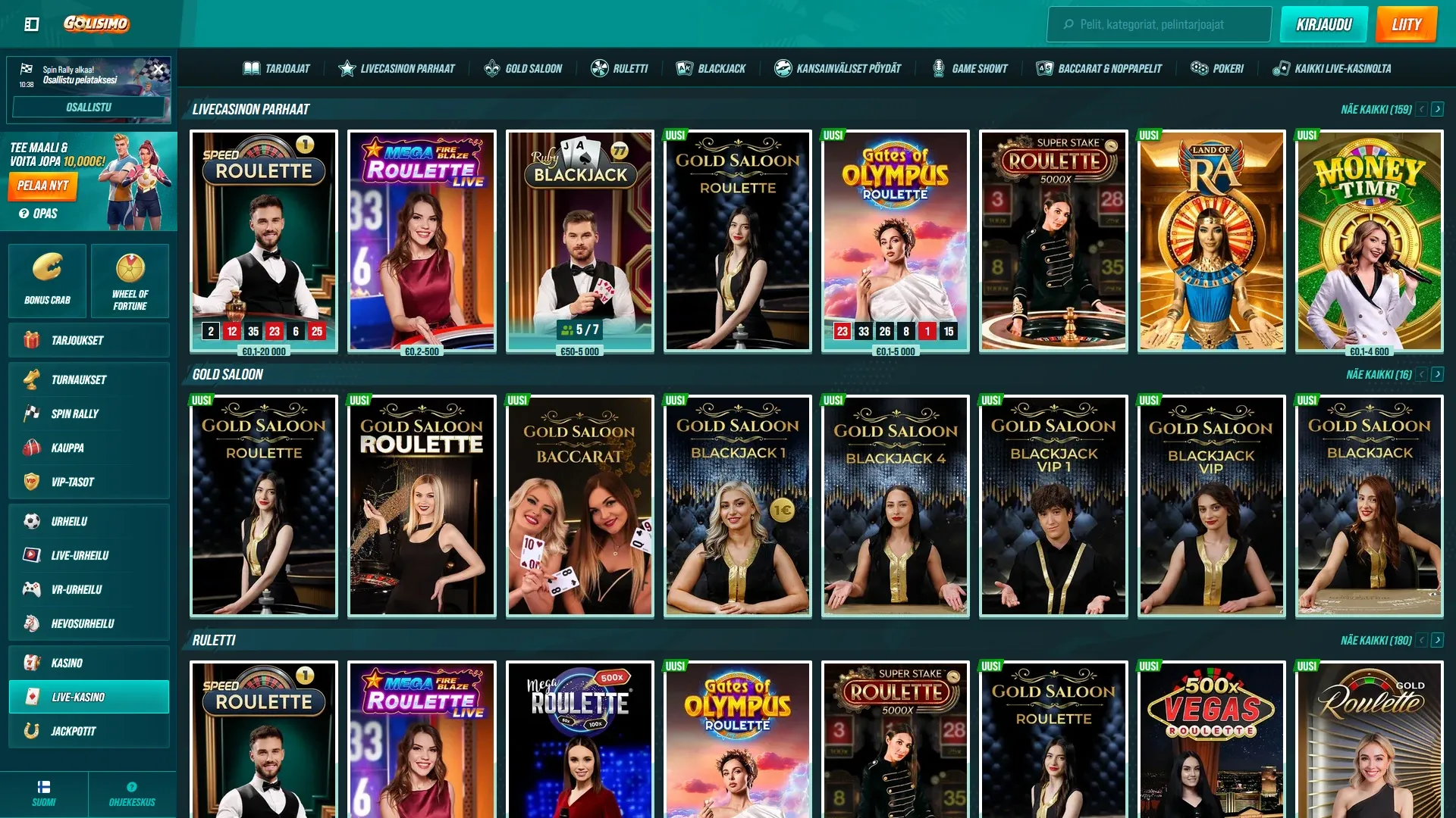 Golisimo ei näytä rakennetun vain yhtä nurkkaa varten. Sivustolta löytyy slotteja, live-kasino, jackpot-pelejä, megaways-pelejä, pöytäpelejä, bonusostopelejä ja muita tuttujen kategorioiden pelejä, joten valikoima ei jää ainakaan liian kapeaksi.