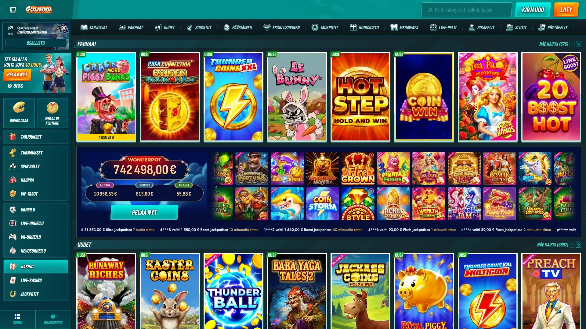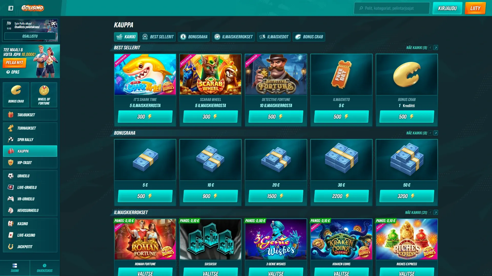 - Tarjoussivulla näkyy muutakin kuin vain perusbonari, kuten Bonus Crab, Wheel of Fortune, turnaukset ja VIP-tasot