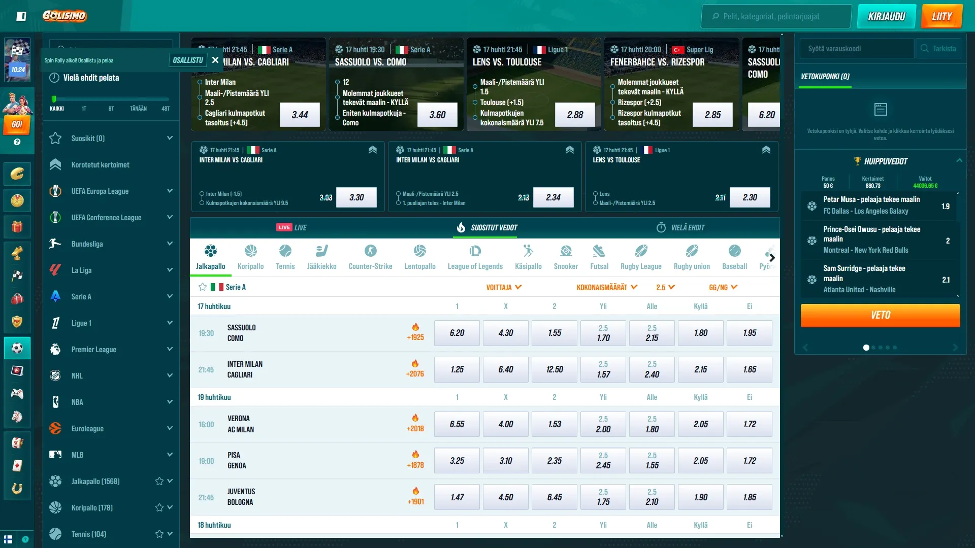Ja jos tykkäät yhdestä tilistä useampaan pelimuotoon, Golisimolla on myös vedonlyönti mukana paketissa. Se voi olla monelle suomalaiselle hyvä lisä, koska välillä on kivempi pitää casino ja sportti samassa paikassa kuin hajauttaa pelit usealle eri sivulle.