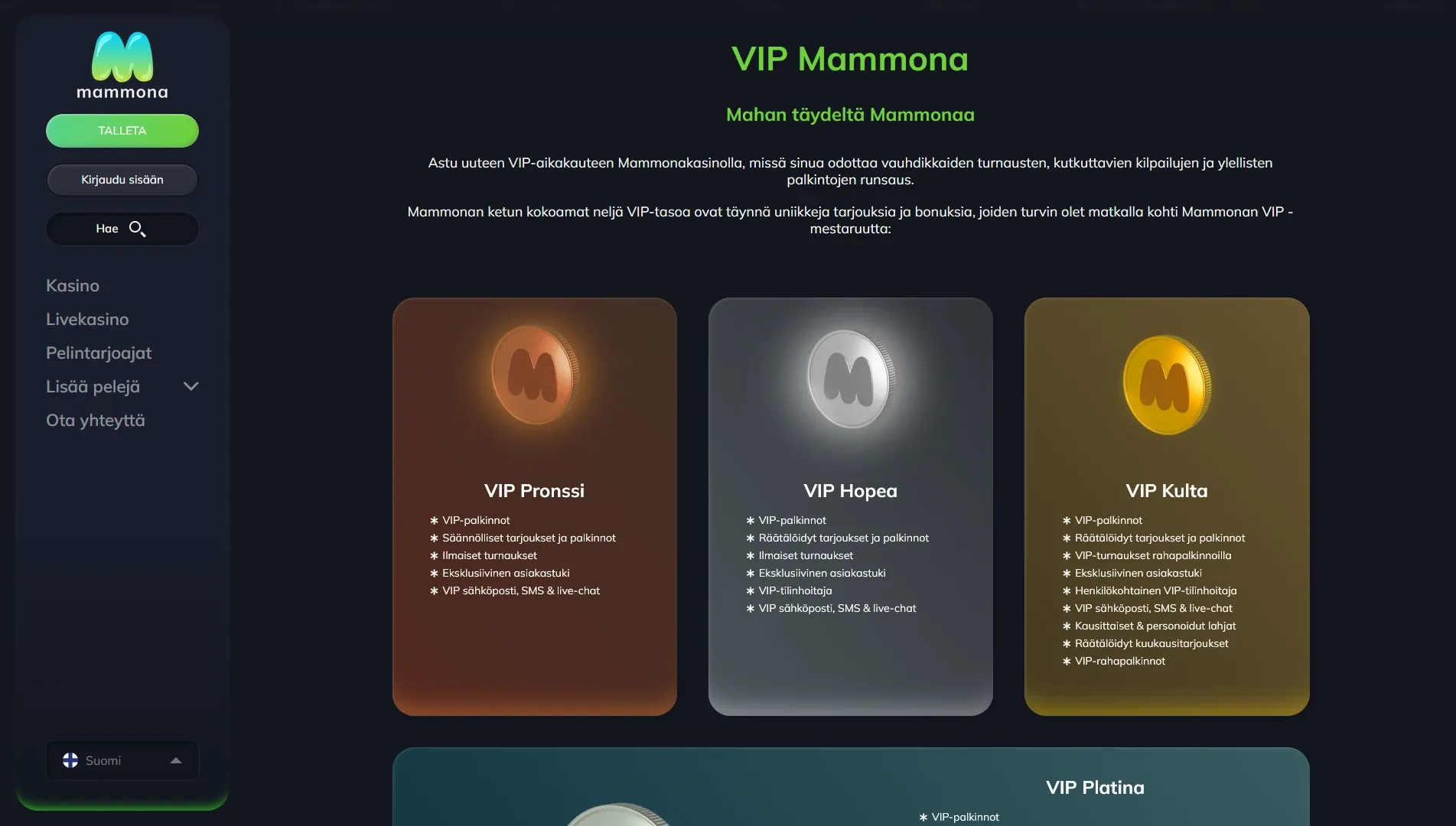 Mammonalla on myös oma VIP-ohjelma, jota nostetaan sivustolla aika näkyvästi esiin. Luvassa on turnauksia, kilpailuja ja erilaisia palkintoja aktiivisille pelaajille. Tämä ei ehkä ole ensitallettajalle se tärkein kohta heti alussa, mutta jos tykkäät jäädä samalle casinolle pidemmäksi aikaa, niin on aina plussaa että tarjolla on muutakin kuin pelkkä tervetulobonari.