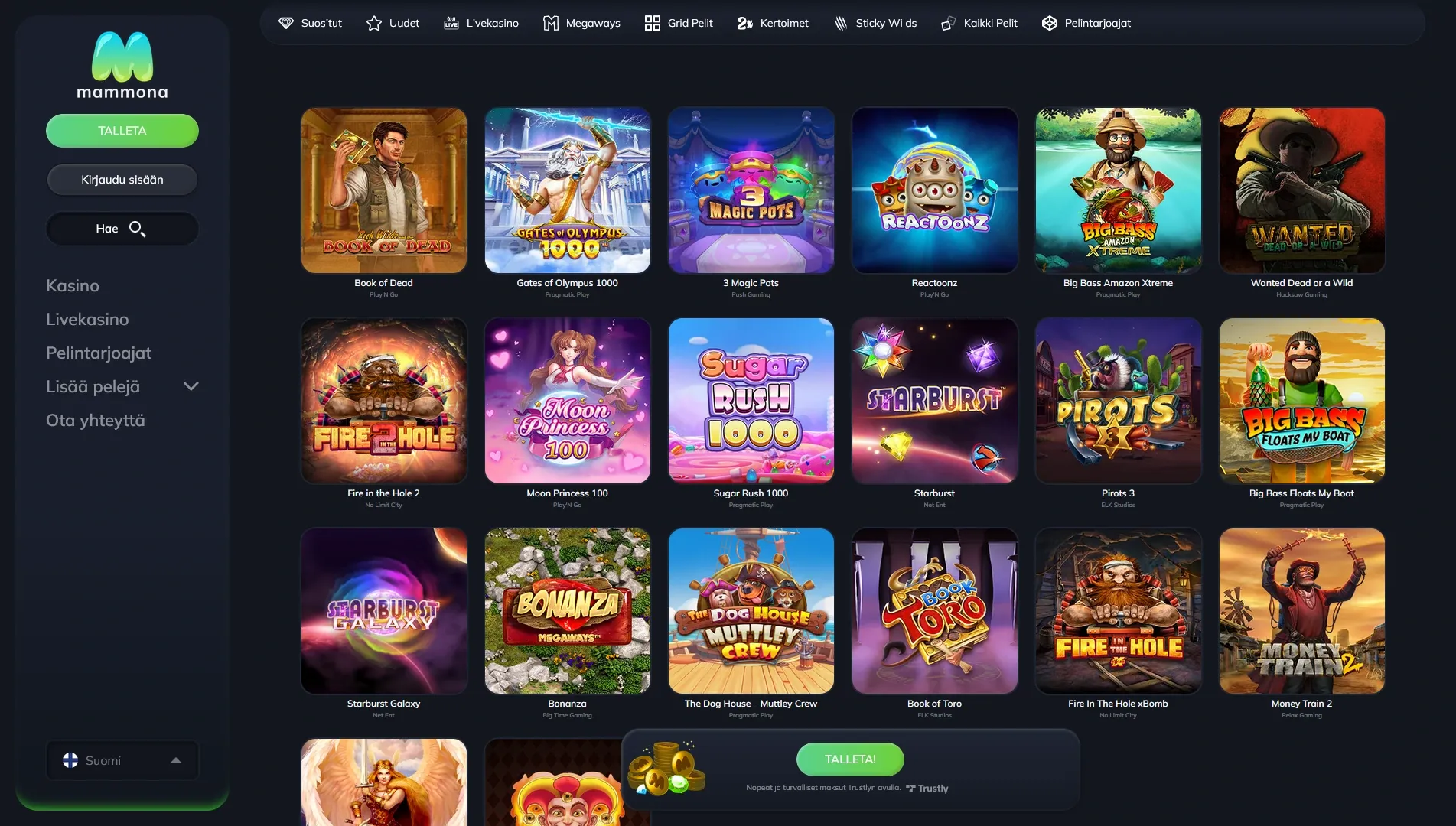 Mammona käyttää Trustlya, joten talletukset ja kotiutukset onnistuvat suomalaiselle pelaajalle tutulla tavalla verkkopankin kautta.