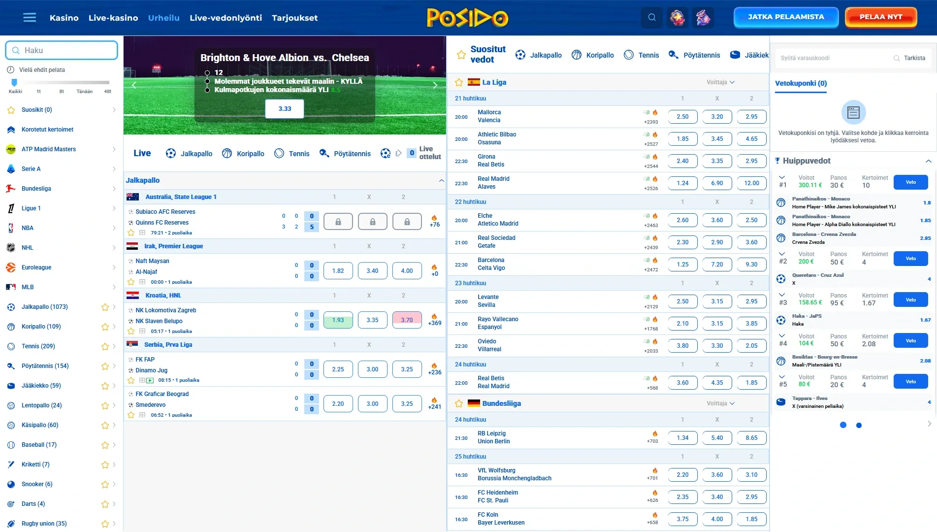 Ja se mikä tekee Posidosta monelle suomalaiselle vielä kiinnostavamman on vedonlyönti. Samalla tilillä voi siirtyä kasinopeleistä urheiluvetoihin ilman että tarvitsee hypellä eri sivustojen välillä. Se tekee kokonaisuudesta paljon monipuolisemman kuin keskiverto uusi nettikasino.